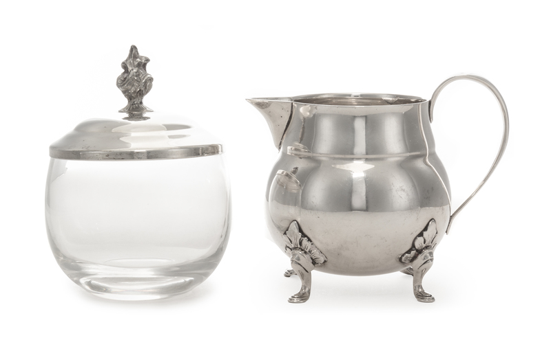 of handled form and raised on four pad feet, together with a silver-plate mounted glass sugar.