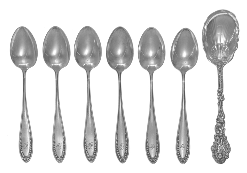 comprising a sugar spoon, Gorham Mfg. Co., Providence, RI, and a set of six teaspoons, Watson Co., Attleboro, MA.
