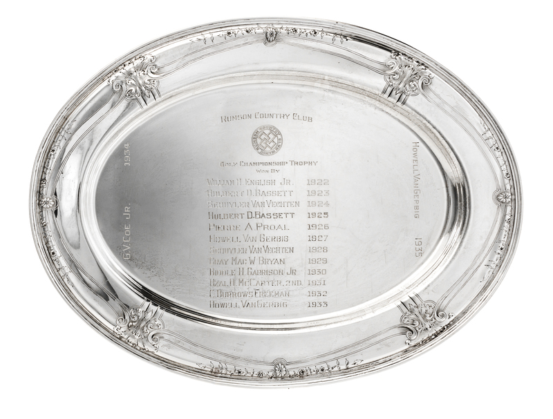 of oval form, chased with foliate decoration at intervals around the border and engraved as a trophy for the Rumson Country Club, 1922-1935.
