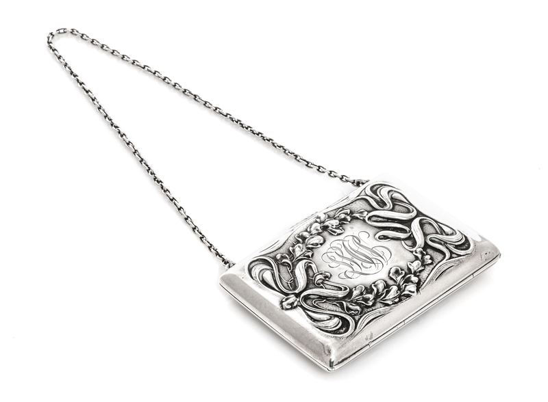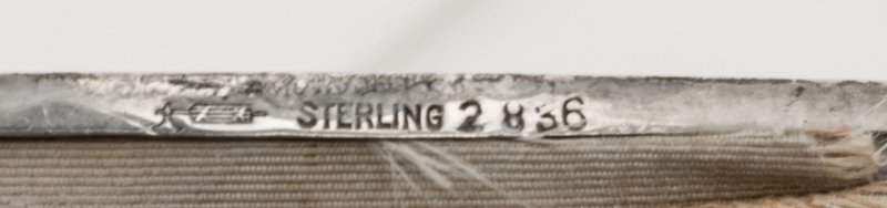 the sides decorated with ribbon and floral decoration, one side centered with a monogram and opening to a fabric lined interior.
