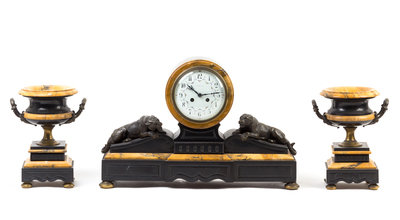 the circular dial with Arabic minutes among garlands, within a conforming case flanked by a pair of recumbent tigers, together with a pair of tazze.