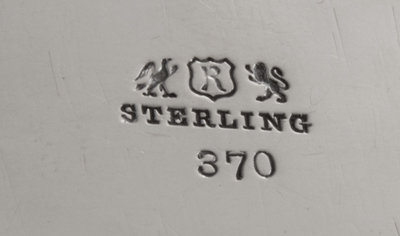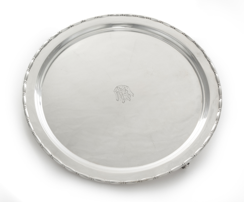 of shaped circular form raised on three openwork bracket feet, the border chased with rocaille cartouches spaced by floral swags, the center monogrammed RBM.