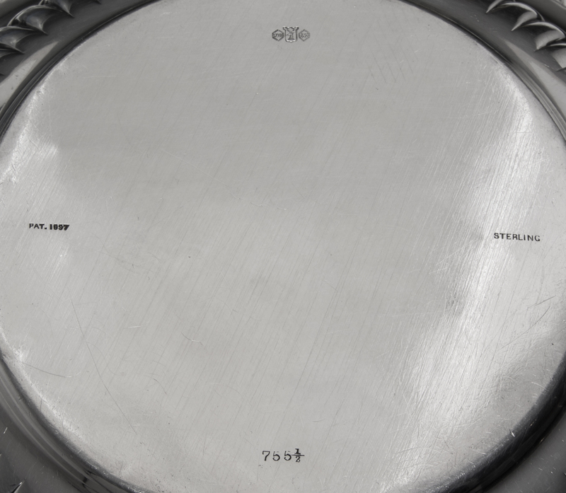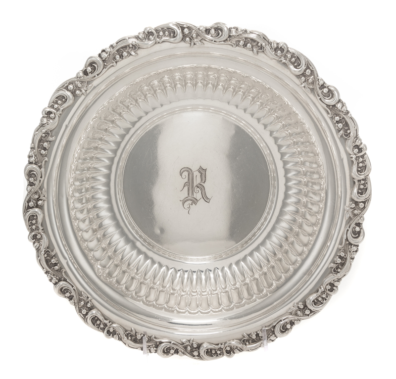 of circular form with an applied foliate scroll rim and reeded sides, the center engraved with the initial R.