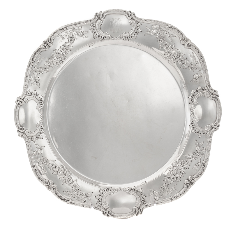 of shaped circular form, the rim chased with alternating floral swags and cartouches, one cartouche engraved with monogram RBM.
