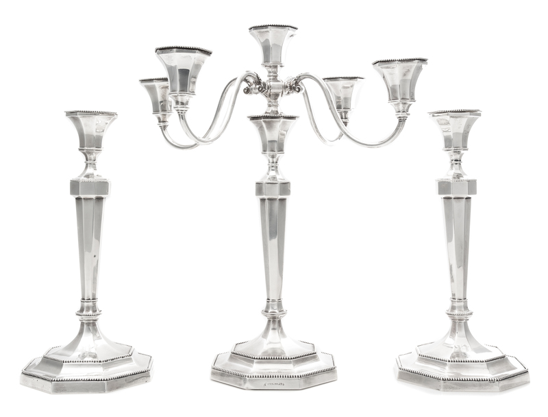 each of paneled baluster form with beaded rims and a weighted base, with one detachable five-light top, engraved with initial R, weighted.
