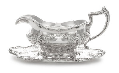 the bulbous body chased with vacant cartouches raised on four scroll feet and with a leaf capped handle, together with a matching shaped oval tray.