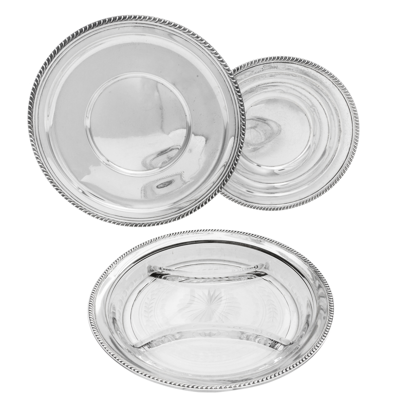 each having a gadrooned border, together with an etched glass tray in a silver frame.
