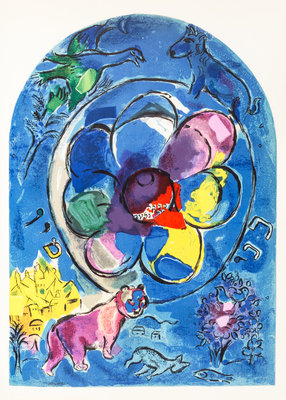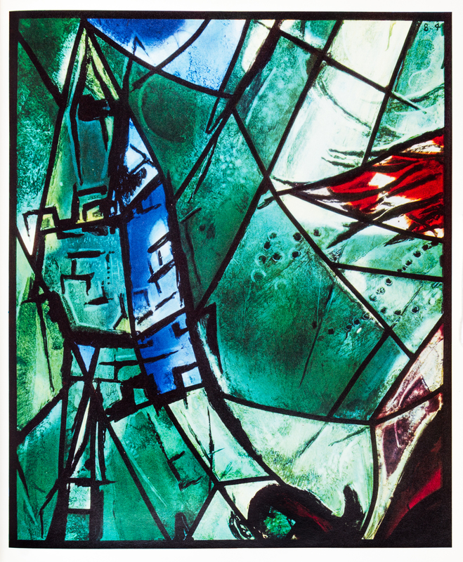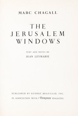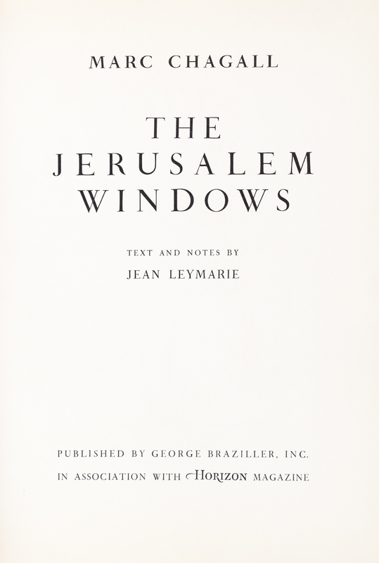 The Jerusalem Windows. New York: George Braziller; Monte Carlo: Andre Sauret, (1962).4to, publisher's gilt-lettered red cloth, dust jacket. First edition, with two original lithographs by Chagall created for this publication and color illustrations throughout. Fading to boards at edges; minor marginal chipping to jacket; light toning to edges of leaves.
