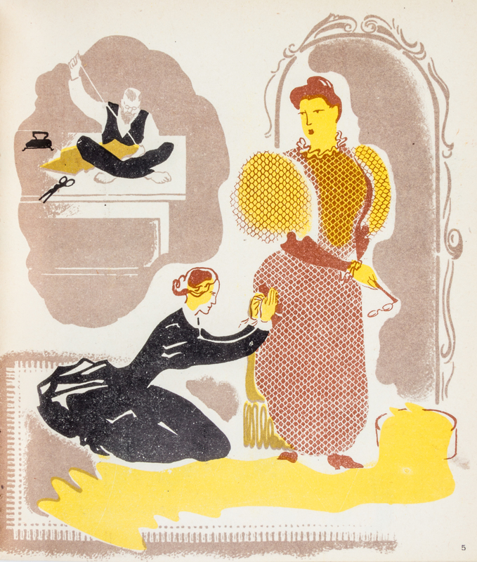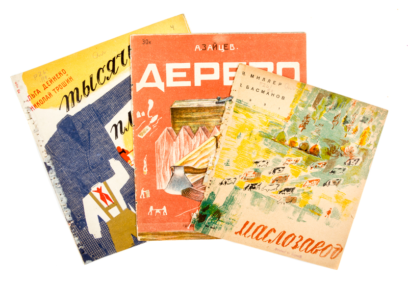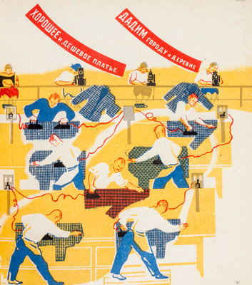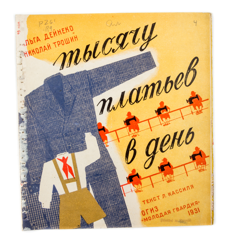Tysiachu platev v den [1,000 Dresses a Day]. OGIZ [Moscow]: Molodaia gvardiia, 1931. Large 8vo, color lithograph wraps (unsewn). Featuring a clothing factory making dresses for the upper class. Together with two other production books tracing industries from raw material to finished consumer good: Derevo [Wood], by Alexandr Zaitsev. Leningrad: GIZ, 1930; Maslovod [The Creamery], by I.A. Miller. Illustrated by Pavel Ivanovich Basmanov. [Leningrad]: GIZ, 1931.