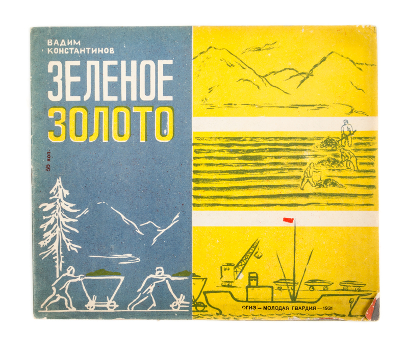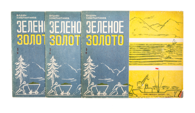 Zelenoe zoloto [Green Gold]. [3 copies] OGIZ [Moscow]: Molodaia gvardiia, 1931.Oblong 8vo, contents stapled in color lithograph wraps. [Together with:] Orekhovye Razvedchiki, by N.A. Severin. OGIZ [Moscow]: Molodaia gvardiia, 1931. (4 total)