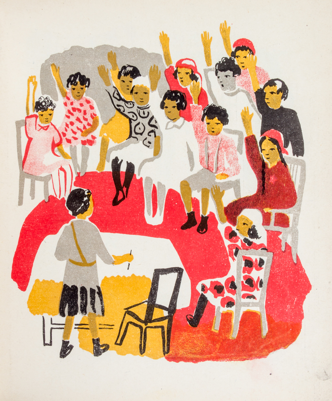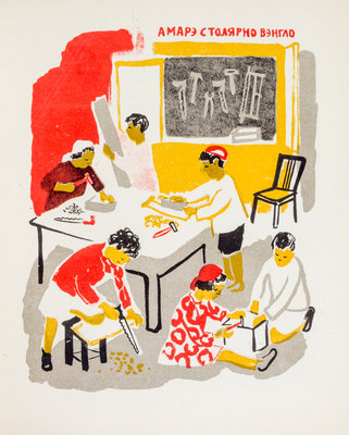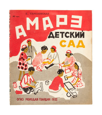 Amare detskii sad [Our Kindergarten]. OGIZ [Moscow]: Molodaia Gvardiia, 1932.4to, original color lithograph wraps (unsewn). Tarakhovskaya sets out to show how national minorities are cherished in the Soviet Union through a post-revolutionary kindergarten class built for gypsy children.