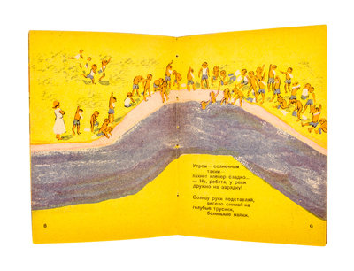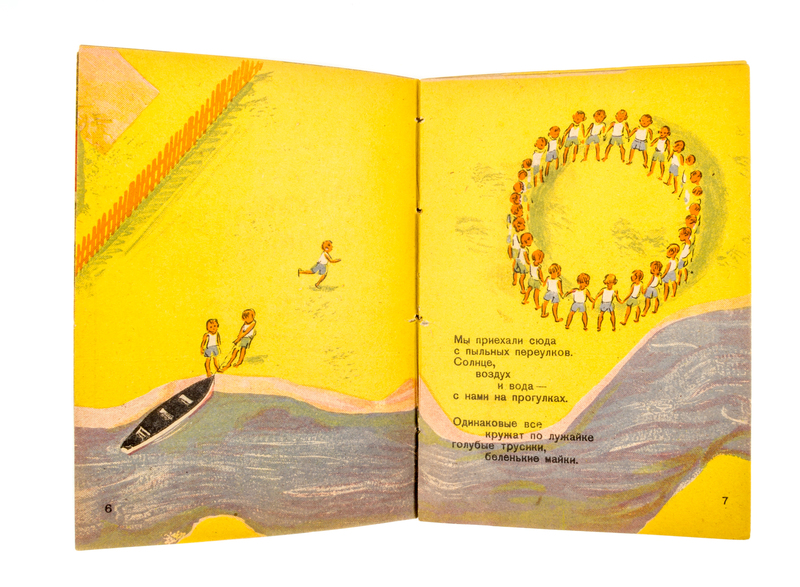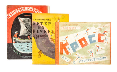 Veter na rechke [Wind Over the Stream]. OGIZ [Moscow]: Molodaia Gvardiia, 1932.12mo, original color lithograph wraps (unsewn). Illustrating a summer camp. [Together with] two other books pertaining to summer activities: Kupatsia Katatsia [To Swim To Ride], by Evgenii Shvarts. Illustrated by V. Ermolaeva. OGIZ [Leningrad]: Molodaia gvardiia, 1931; Kross: beg s prepiatstviiami, by P. Novikov. OGIZ [Leningrad]: Molodaia gvardiia, 1932. (3 total)