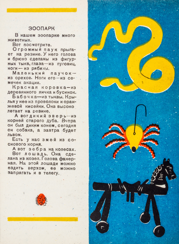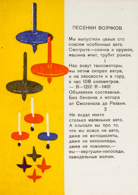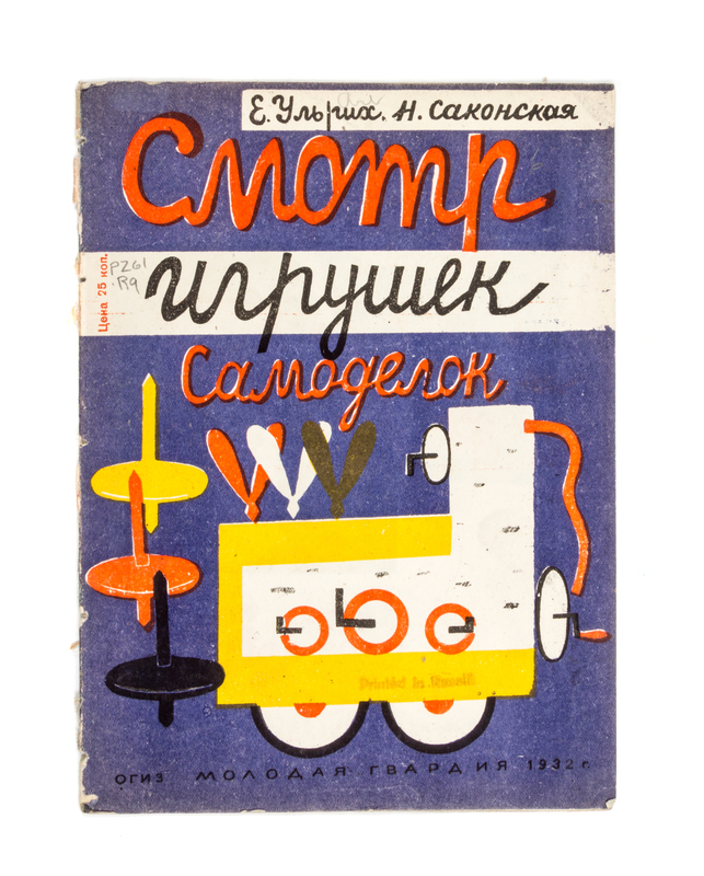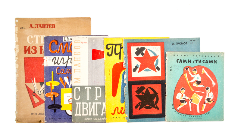 Smotr igrushek samodelok [The Review of Selfmade Toys]. OGIZ [Moscow]: Molodaia gvardiia, 1932.12mo, original color lithograph wraps (unsewn). An important aspect of Soviet children's books involved do-it-yourself books, which taught children how to make toys with cut-outs and from natural materials. [Together with] five other works pertaining to toy-making: Stroim dvigateli [We Are Building], by M. Pankov. Illustrated by Lidia Popova and Andrey Nikiforov. OGIZ [Leningrad]: Molodaia Gvardiia, 1931; Traferety, by Gromov. OGIZ [Leningrad]: Molodaia gvardiia, 1931; Prygaiut, letaiut, by L. Sinitsyna. OGIZ [Moscow]: Molodaia gvardiia, 1931; Sami s tisami, by B. Uralskii. Illustrated by Ju Syrneva. OGIZ [Moscow]: Molodaia gvardiia, 1931; Stroim iz kartona, by A. Laptev. OGIZ [Moscow]: Molodaia gvardiia 1932. (6 total)