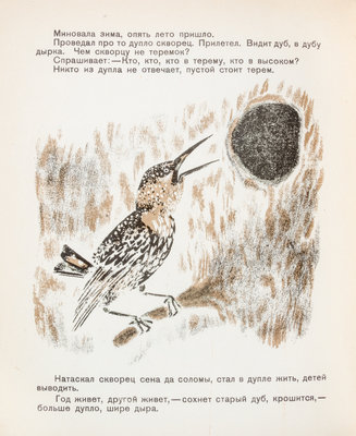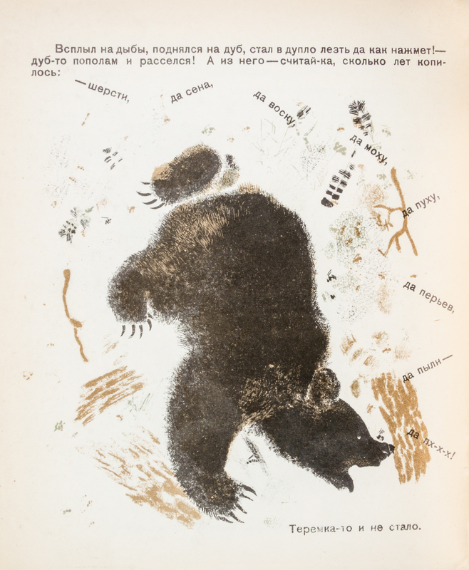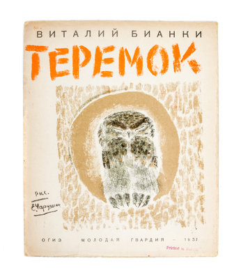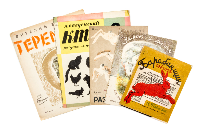 Teremok. OGIZ [Leningrad]: Molodaia gvardiia, 1931. 4to, contents stapled in color lithograph wraps. Featuring various animals in trees. [Together with] five other books pertaining to animals: Shum na dvore, by K. Lomovitskii. [Moscow]: Molodaia gvardiia, 1932. Various barnyard animals are illustrated; Raznye zveri, by Evgenii Cherushin. OGIZ [Leningrad]: Molodaia gvardiia, 1931; Kto? by A. Vvedenkii. Leningrad: Molodaia gvardiia, 1931. Regarding the sounds animals make; Barabanshchik sovkhoza, by Nadezhda Pavlovich. [Moscow]: Molodaia gvardiia, 1931; Dve irki, by I. Zagriaskova. OGIZ [Moscow]: Molodaia gvardiia, 1931. (6 total)