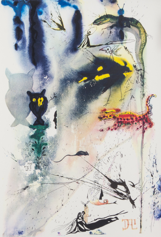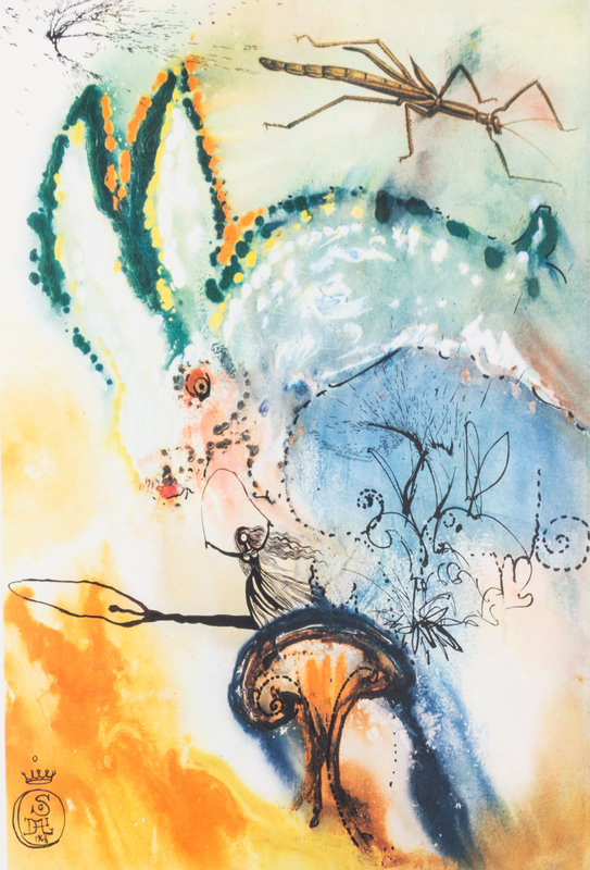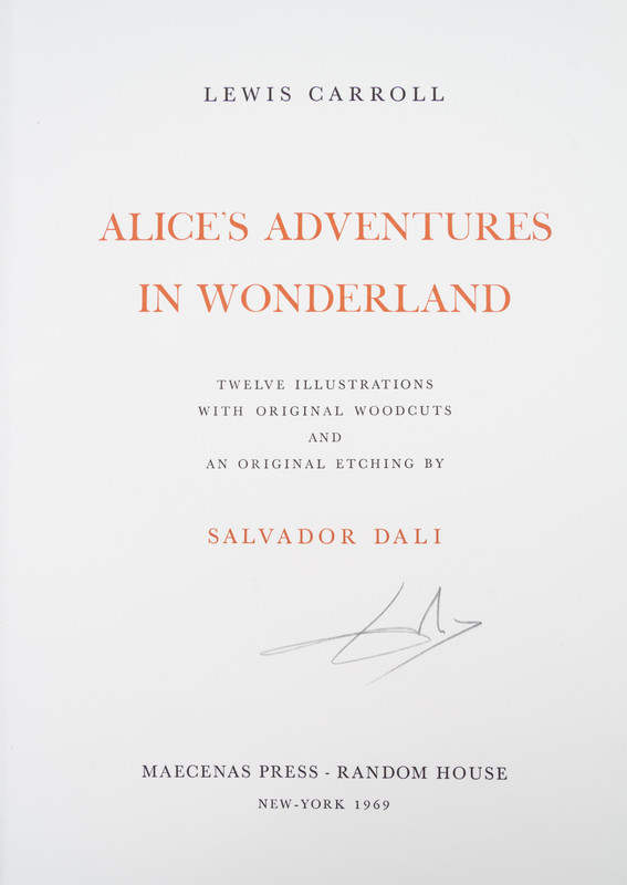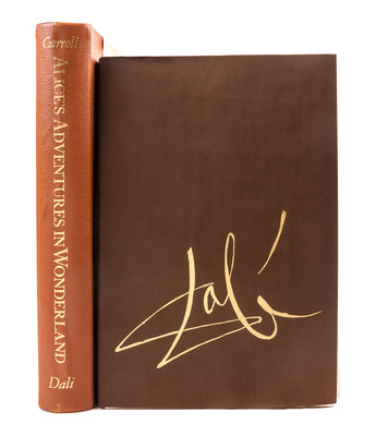 Alice's Adventures in Wonderland. New York: Maecenas Press - Random House, 1969. Folio, contents loose as issued in gilt-lettered cloth chemise and quarter tan leather clamshell box, with leather ties and bone clasps, etched frontispiece and 12 colored plates with Dali remarque. Limited to 2,500 copies, of which this is 791 on Mandeure paper, signed by Dali on the title page. Light cockling to folder and spine; some edgewear to spine ends.