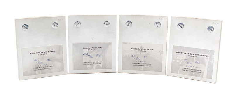 A group of four flip books featuring scenes of Chicago, including Oak Street Beach Underpass (xx/500, sample, initialled), Lincoln Park Zoo (457/500, initialled), North Avenue Beach (xx/500, sample, initialled) and From the Sears Tower (xx/500, sample, initialled). Chicago: self published, 1991.