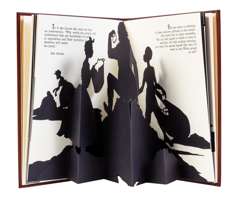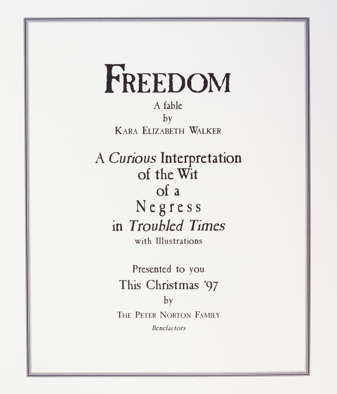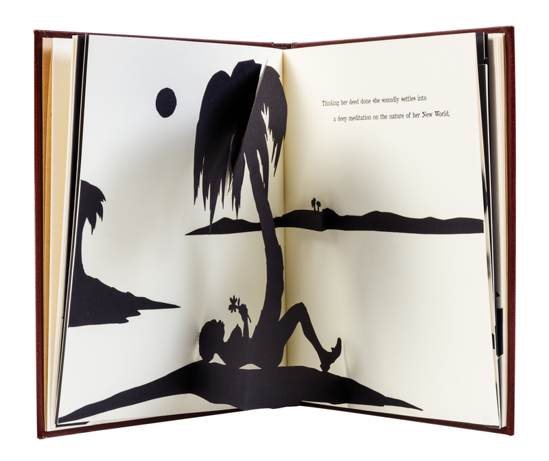 Freedom, A Fable: A Curious Interpretation of the Wit of a Negress in Troubled Times. Los Angeles: Peter Norton Family, 1997.Oblong 4to, original full red leather binding stamped in blind. One of 4,000 copies of this pop-up book, featuring offset lithographs and five laser-cut, pop-up silhouettes on wove paper. Each year, the Norton family commissioned an art work to celebrate the Christmas season; the book was privately published for friends. Light crease to second to last pop-up.