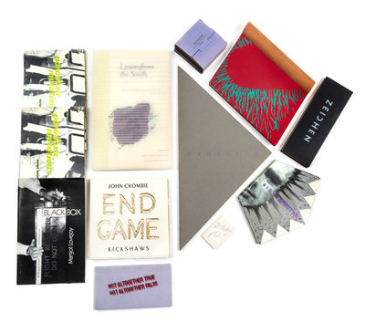 A group of 11 works (one duplicate). End Game, by John Crombie and Sheila Bourne (Paris, 1990); Black Box, by Margot Lovejoy (Oakdale, NY, n.d.); Paradoxic Mutations, by Margot Lovejoy (NY/Philadelphia, 1994), two copies, one in plastic wrap; Lessons from the South, by Susan King (Atlanta, Nexus Press, 1986), inscribed to Buzz Spector; Not Altogether, by Nancy Garruba (s.l., 1986); High Tension, by Philip Zimmerman (Rochester, NY, 1993); Tropos, by Kevin Osborn (Arlington, VA, 1988); Zeichen, eine Drucksache, by Elmar Heimbach (Leporello, 1984), signed; Walking Middletown, by Emily Larned (Brooklyn, NY, Red Charming, 2002); Parallel, by Kevin Osborne (Atlanta: Nexus Press, n.d.), signed.