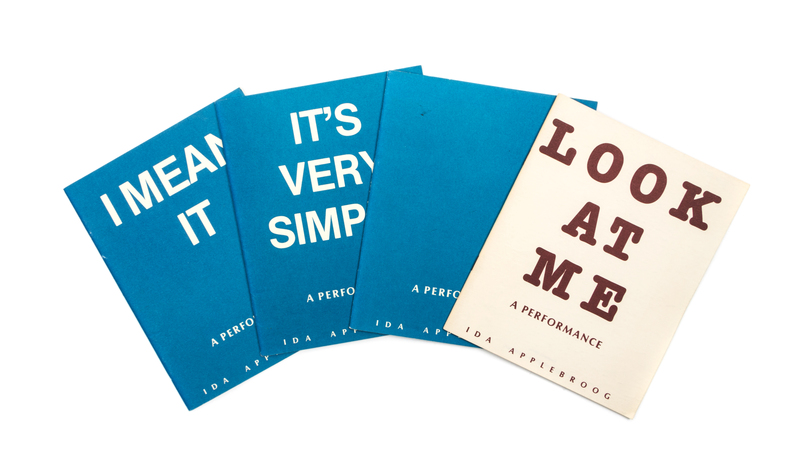 Blue Books. New York: self published, 1981.3 (of 7) vols. only. Thin 8vo, original blue printed wraps. Includes It's Very Simple, I Mean It, and A Performance: The End. [Together with:] Look at Me: A Performance. New York: Dyspepsia Works, 1979.
