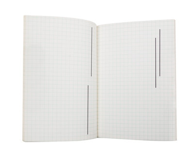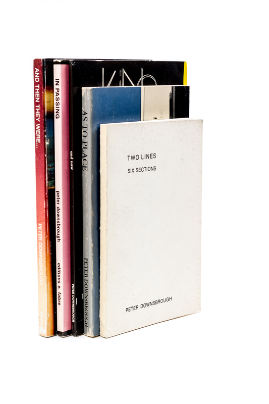 Two Lines: Six Sections. Paris: Gallery 9, 1973.18mo, printed wrappers, offset lithograph on graph paper. First edition of the artist book featuring two perpendicular lines cut into six sections, exploring the relationship of forms and the space of the page.[Together with four others by Downsbrough]:As to Place (NY, 1978), And Now (Maison de la Culture, 1983), In Passing, cut and move (Paris, 1982), And Then They Were... (Chagny, 1985).