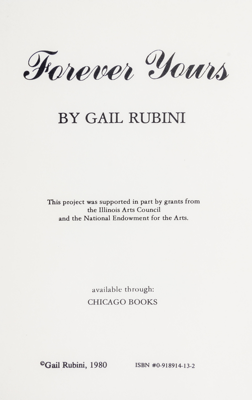 A group of four books published by Chicago Books. Forever Yours by Gail Rubini (Chicago, 1980); Seeing Egypt, by Jim Snitzer (Chicago, 1980); Sweet Junk, by Gail Rubini (Chicago, 1977); The Courtship of Chairs, by Rebecca Michael, with an inscribed card (Chicago, 1979); Book Articulations, by Jeffrey Lew (Chicago,