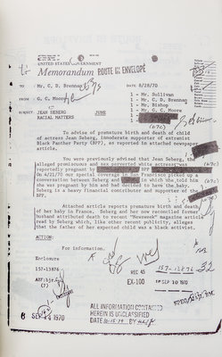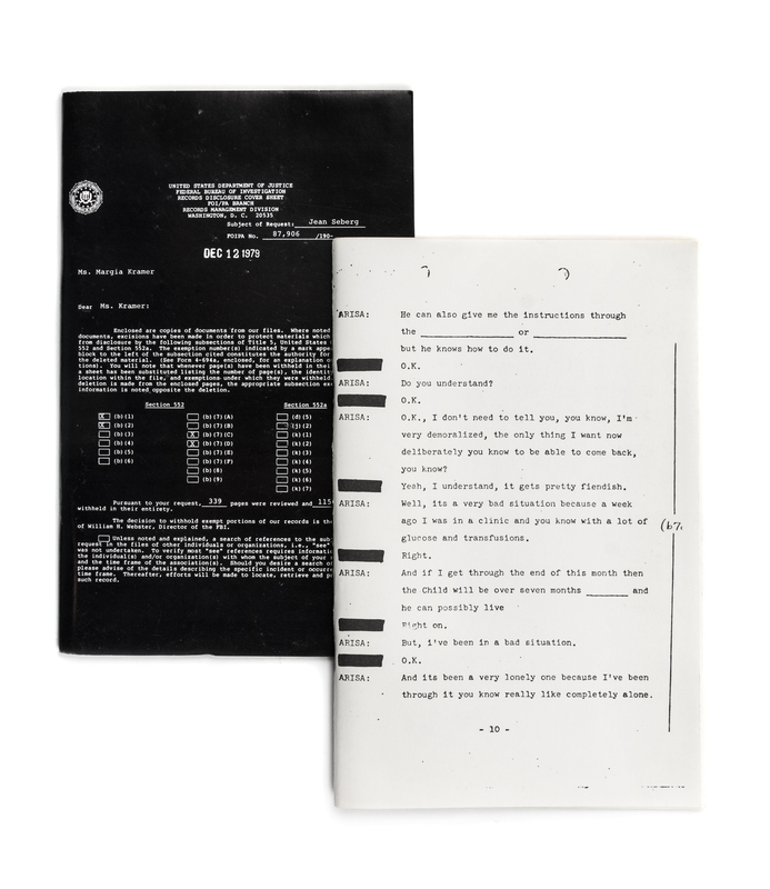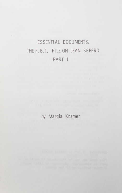 Essential Documents: The FBI File on Jean Seberg. Parts 1 and 2. [s.l.]: self published, 1979.2 vols. Thin 8vo, original printed stapled wraps. Part of "Secret" from the "Freedom of Information Act" work by Margia Kramer.