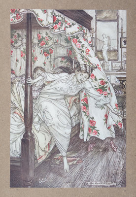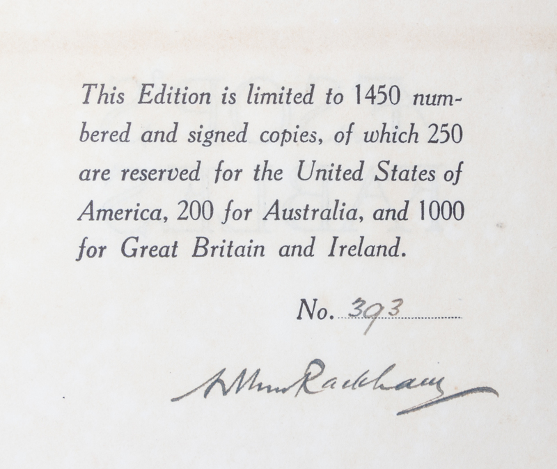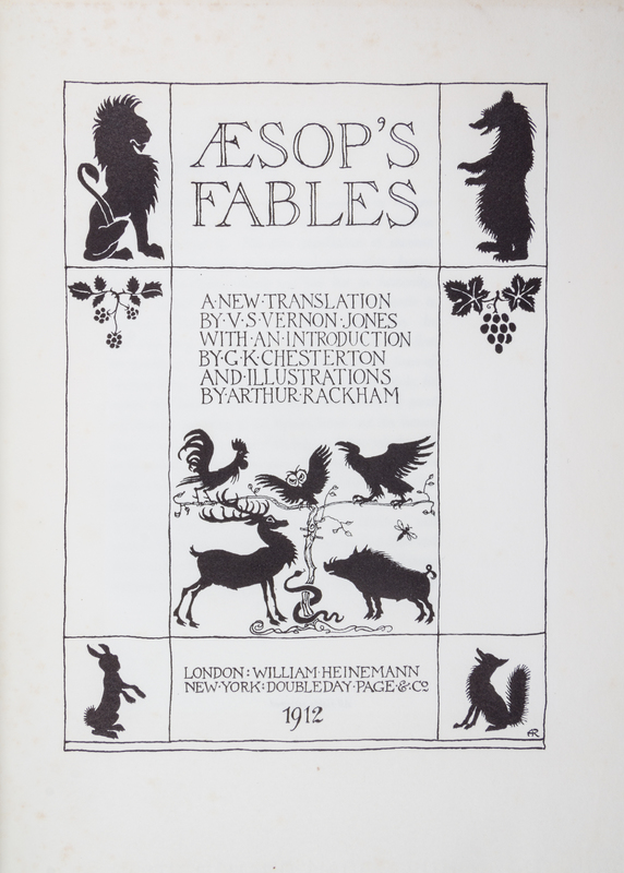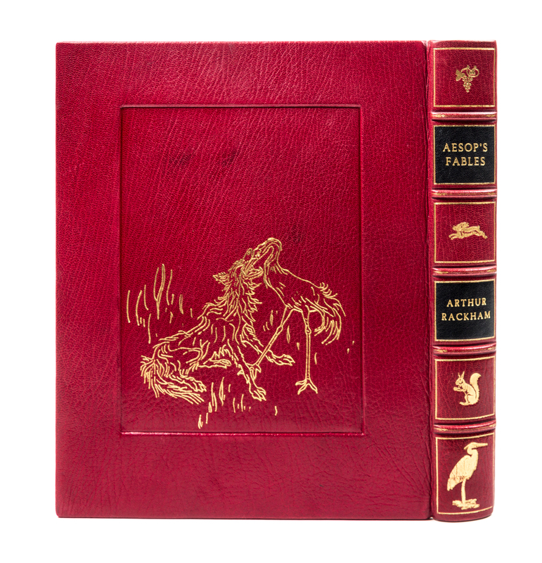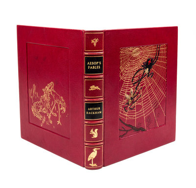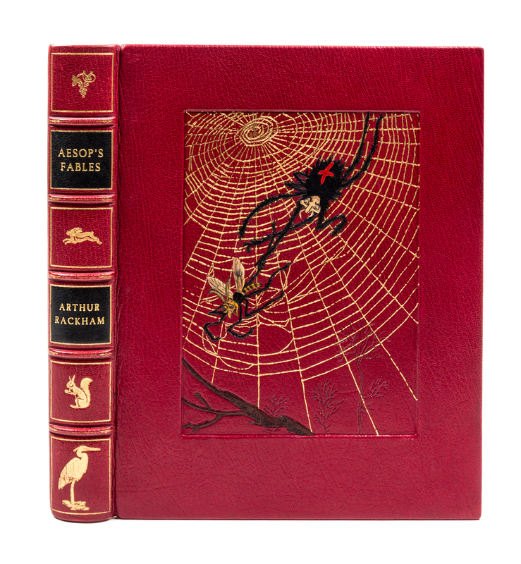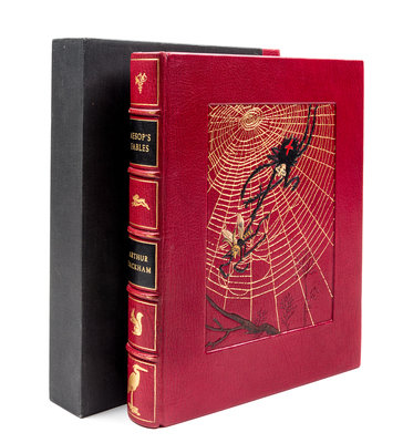 Aesop's Fables. London: William Heinemann, 1912.4to, finely bound by Herbert Weitz of Weitz-Coleman (stamped NYC 1992) in full deep red crushed morocco, inset onlaid character portrait of the spider and gnat from Aesop's "Gnat and the Lion" fable (after Rackham's illustration facing p. 198, gilt illustration of the wolf and the crane on the rear cover, spine in six compartments decorated with gilt animals and black lettered in gilt, a.e.g., marbled endpapers, gilt ruled turn-ins, quarter morocco and black cloth slipcase. Limited edition, number 393 of 1,450 copies signed by Rackham. Profusely illustrated with tipped-in color plates.
