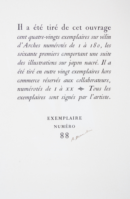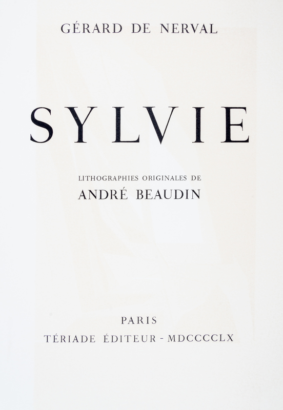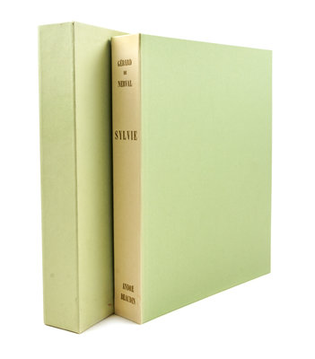 Sylvie. Paris: Teriade, 1960.4to, loose as issued in printed wraps, glassine jacket, green board slipcase and matching chemise, gilt-lettered spine. Limited edition, number 88 of 180 copies printed on velin d'Arches, signed by the artist on the limitation page. Complete with 30 color lithographs by Beaudin, including 20 hors-texte, printed by Mourlot. Spine of chemise faded and starting at the top right edge; offsetting from most prints.