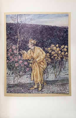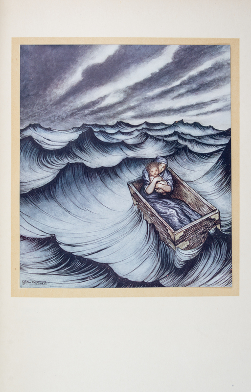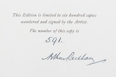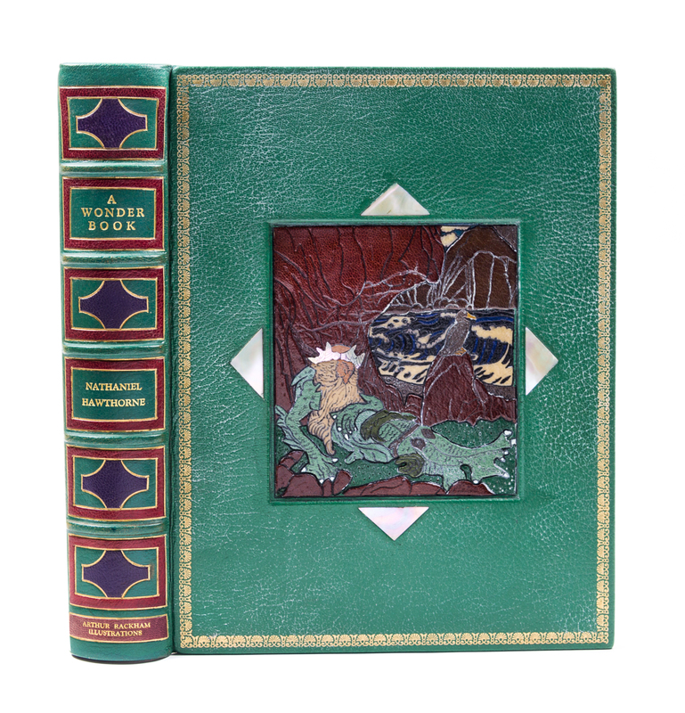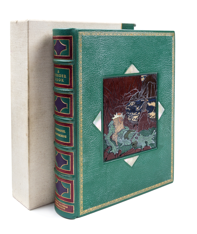 A Wonder Book. London: Hodder and Stoughton, n.d.4to, finely bound by Bill Halpin (stamped B.H. 83 in gilt) in full green crushed morocco, inset central cartouche featuring onlaid leather design of the Old Man of the Sea (after Rackham's illustrated facing p. 117) to the upper board, with inset mother of pearl triangles at each side, spine in six compartments with onlaid purple and maroon geometric designs, lettered in gilt, linen endpapers, gilt turn-ins, quarter morocco linen-backed slipcase. Limited edition, number 591 pf 600 copies signed by Rackham. Profusely illustrated with tipped-in color plates. Wear to upper and lower board.