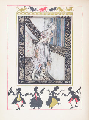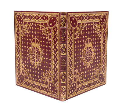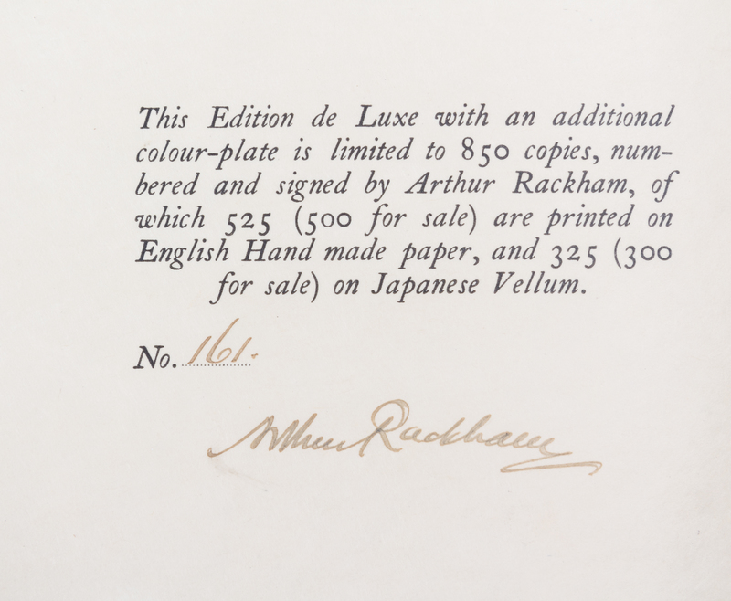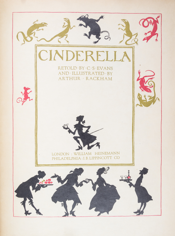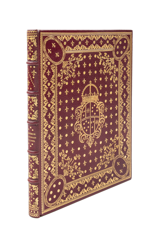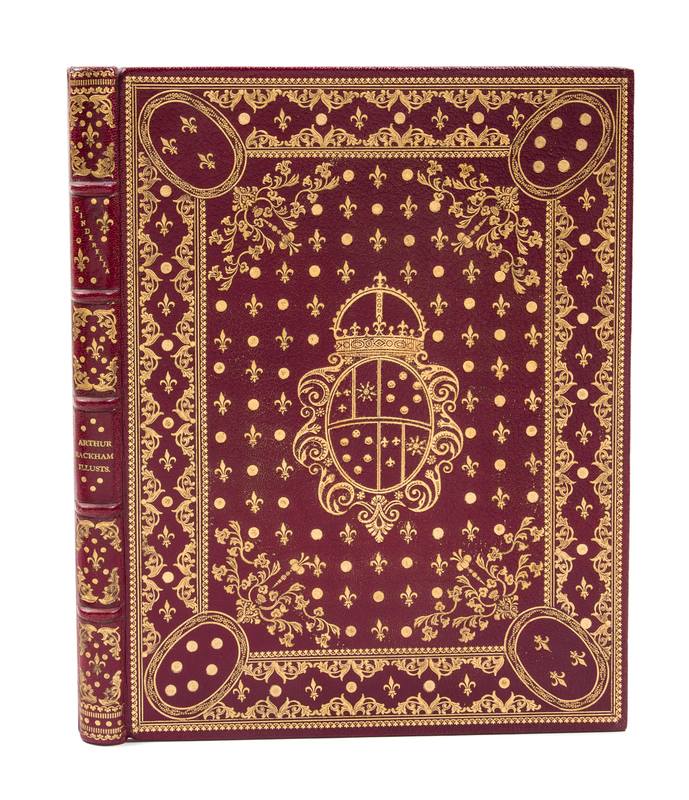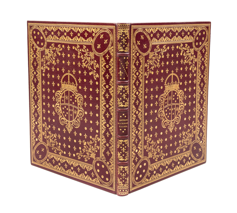 Cinderella. London: William Heinemann; New York: J.B. Lippincott, 1919.Thin 4to, bound by Bill Halpin (stamped "Bill Halpin" in gilt) in full maroon elaborately gilt with central armorial cartouche surrounded by vines and fleurs-de-lis, repeated on the rear cover, silk endpapers, gilt turn-ins. Limited edition, number 161 of 850 copies signed by Rackham. Profusely illustrate with tipped-in color plates.