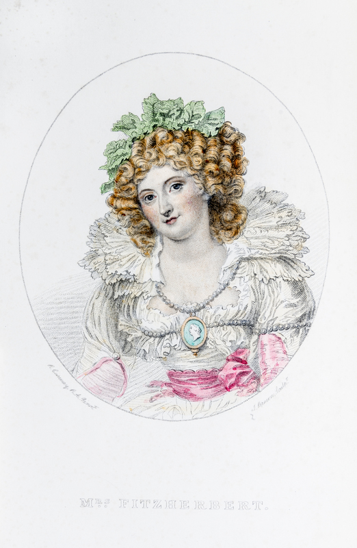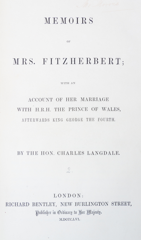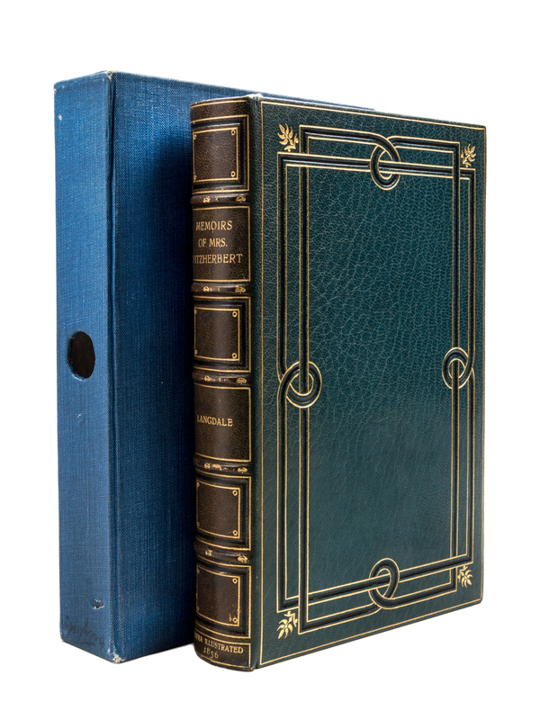 Memoires of Mrs. Fitzherbert; with an Account of Her Marriage with H.R.H. the Prince of Wales, Afterwards King George the Fourth. London: Richard Bentley, 1856.8vo (8 3/4 x 5 3/4 inches), bound by Bayntun in full crushed turquoise morocco for C.E. Lauriat of Bath (stamp-signed in front turn-in), covers with two interlaced rectangular frames of gilt and black, foliate cornerpieces, raised bands, spine compartments with concentric black and gilt frames, lettered in gilt, gilt turn-ins with French fillet frame and arabesque cornerpieces, marbled endpapers, a.e.g., housed in felt-lined blue buckram slipcase. First edition. Complete with 38 plates (10 in color) and extra-illustrated with 37 additional plates with tissue guards. Spine sunned.