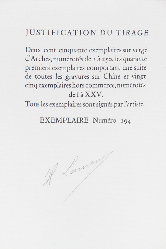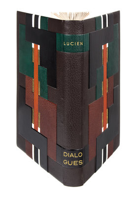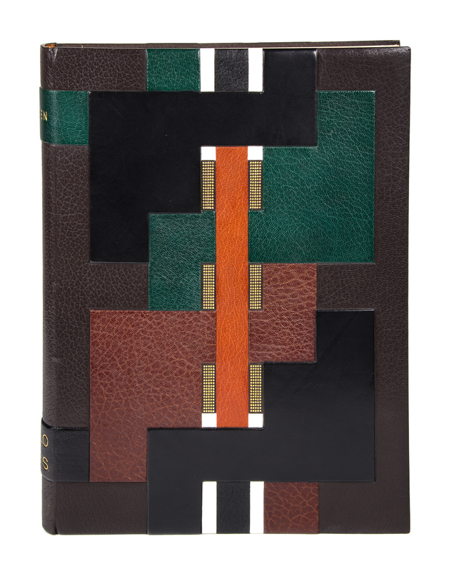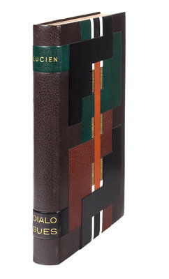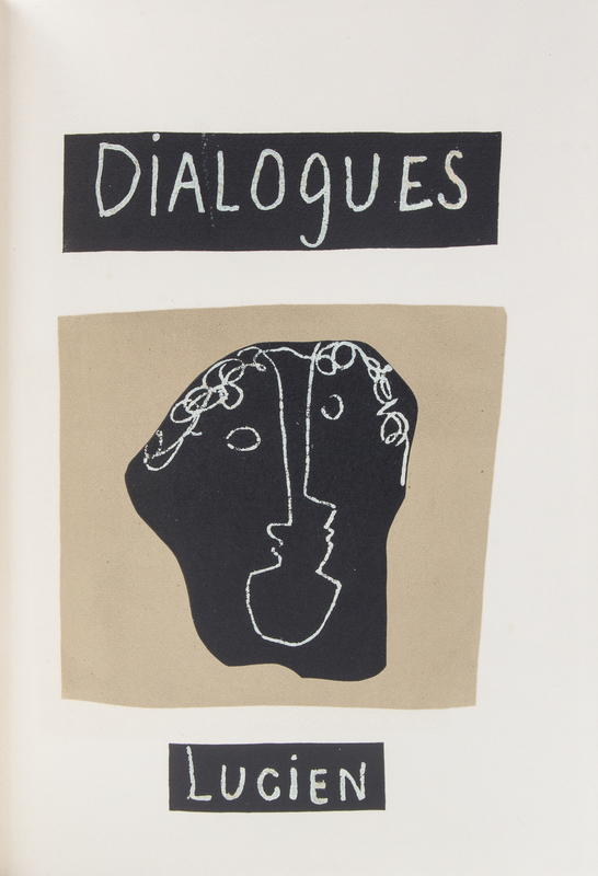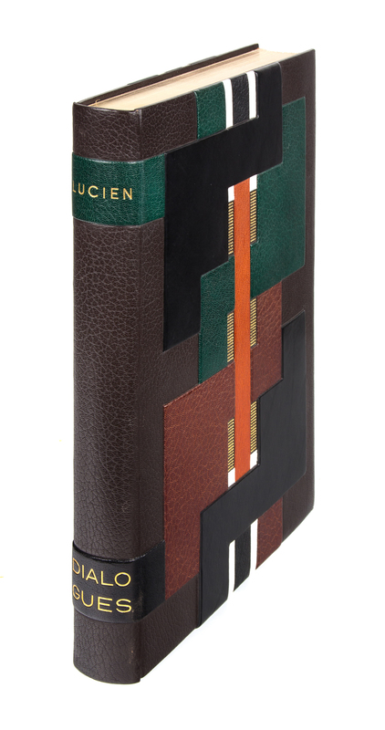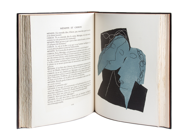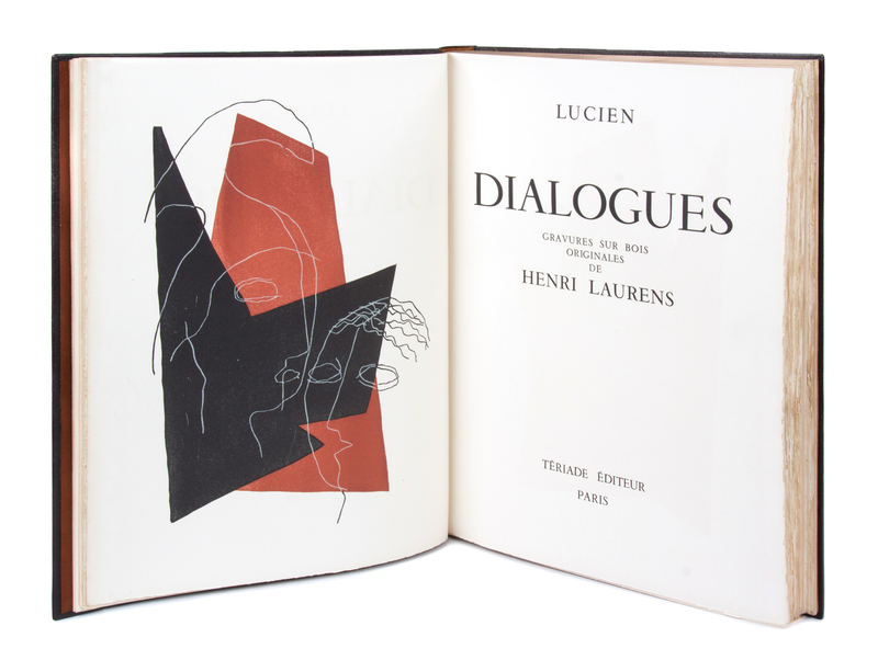 Dialogues. Paris: Teriade, [1951]. Folio, bound in an abstract geometric morocco binding by Robert Bonfils with matching faux wood slipcase and chemise, brown suede doublures, gilt-lettered spine, original wrappers bound in. Limited edition, number 194 of 250 examples on Cine signed by the artist in pencil to the limitation page. Complete with 24 hors-texte color woodcut plates, as well as vignettes and a double-page index. Light foxing to edges of last few leaves; some light offsetting; otherwise fine.