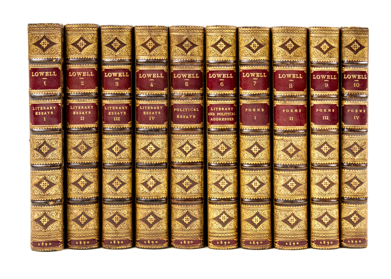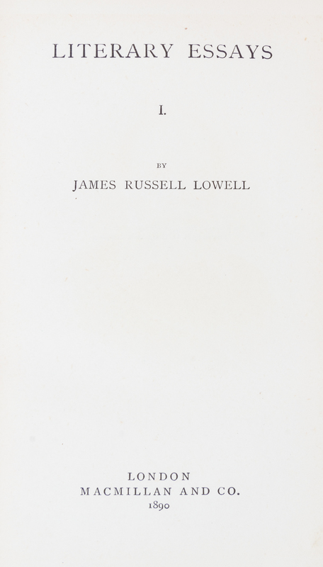 The Writings. London: Macmillan, 1890.10 vols. Small 8vo, (7 1/2 x 5 1/4) bound by Sangorski & Sutcliffe in olive green textured calf, stamped in blind with a basketweave pattern, spines gilt in compartments, marbled endpapers, gilt turn-ins. Riverside edition. Some very minor shelf wear at corners; otherwise a fine set.