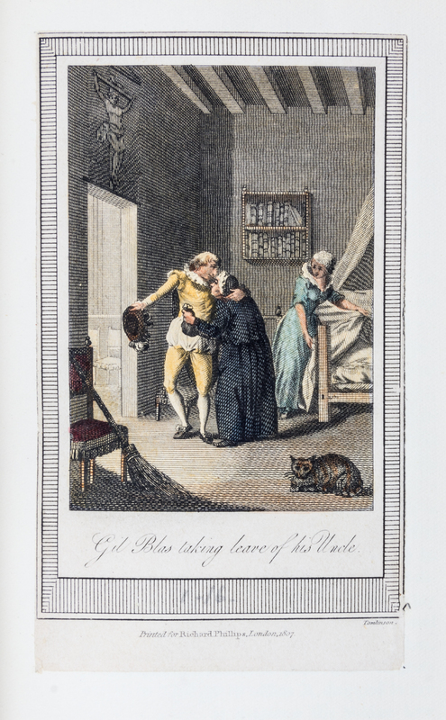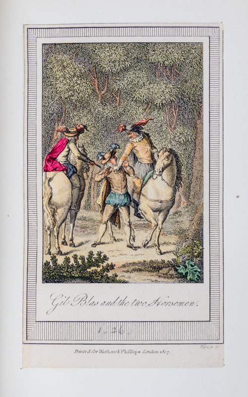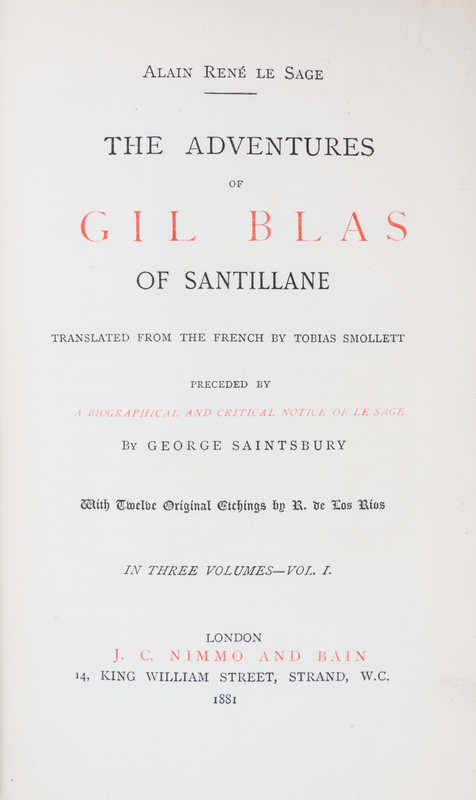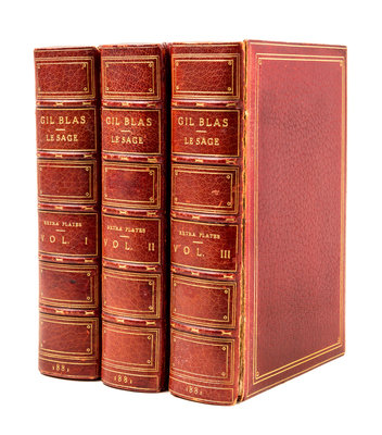 The Adventures of Gil Blas of Santillana. Translated from the French by Tobias Smollett. Preceded by a Biographical and Critical Notice of Le Sage by George Saintsbury. London: J.C. Nimmo and Bain, 1881.3 vols. 8vo (7 3/8 x 5 inches), bound by Bayntun of Bath in full crush red morocco, a.e.g, marbled endpapers, gilt turn-ins. Complete with 12 original etchings by de Los Rios, as called for, and extra-illustrated with 95 hand-colored plates by Warner, Tomlinson and others. One board detached; others with minor cracks repaired by glue; spines slightly scuffed; a few fore edge tears to one plate.