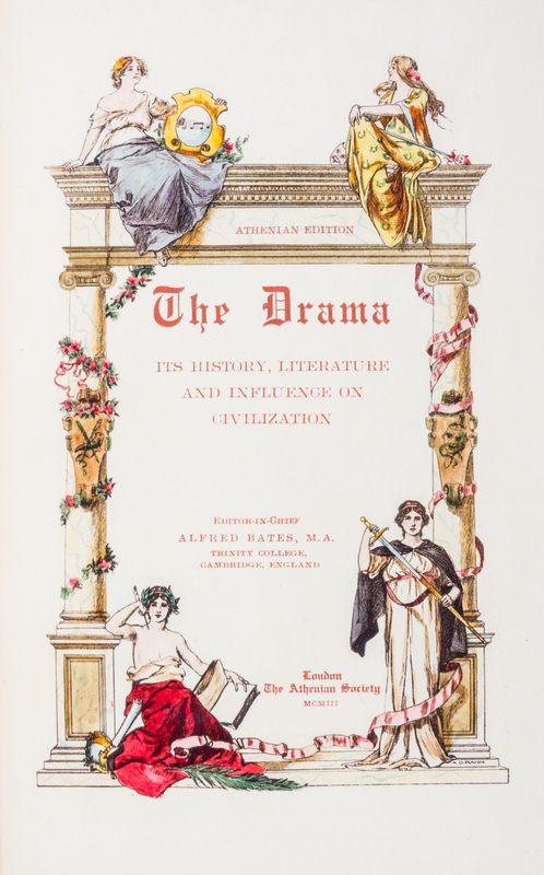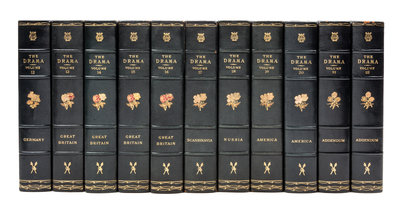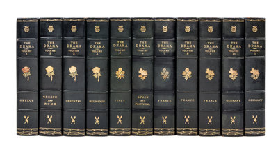 The Drama: Its History, Literature and Influence on Civilization. London: Athenian Society, 1903-1904.22 vols. 8vo (9 3/8 x 6 1/2 inches), 3/4 navy morocco over marbled boards, gilt-lettering and floral onlays to spines, t.e.g. The Athenian Edition, limited to 250 numbered sets, of which this is 63. With 120 plates (including two frontispieces in each of the first 20 volumes, one in black and white, and the other in color), as well as 20 title pages with illustrated frames (the first in color, the rest in sepia) and 20 borders, one at the beginning of each prologue (19 sepia, one black and white), and 13 sepia tailpieces, each coming at the end of a prologue. Letterpress tissue guards.