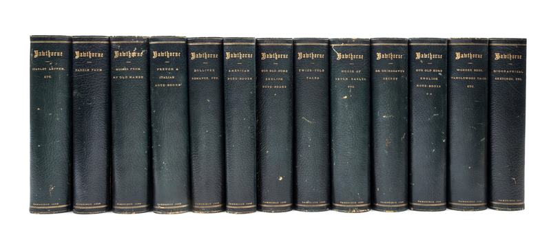 The Complete Works. Cambridge: Riverside Press, 1883. 13 vols. 8vo, bound in full blue morocco for G.P. Putnam's Sons, decorative endpapers, gilt turn-ins, t.e.g. Riverside edition, number 19 of 250 copies, with etchings by Blum, Church, Dielman and others. Hinges tender; spines lightly faded; some minor edgewear; bookplate tipped in front pastedown: William Holt Averall.