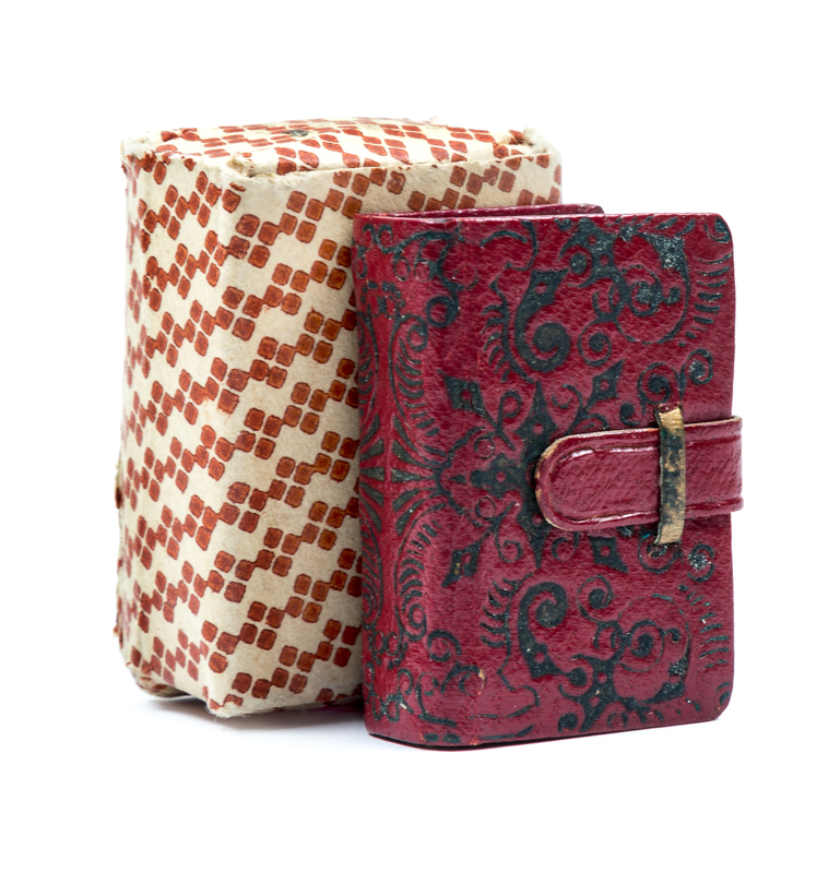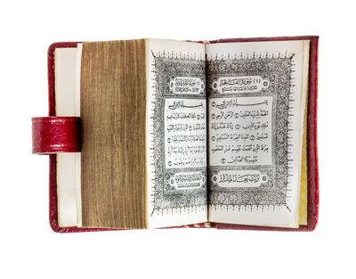 A miniature Qur'an. (3 1/2 x 2 1/2 cm), full red morocco with arabesque design stamped in black, folding clasp, decorative paper box.