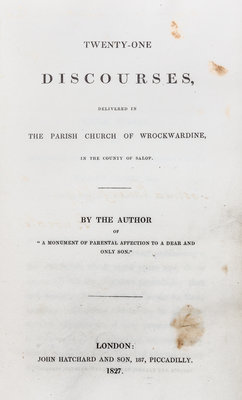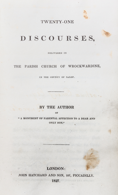 Twenty-one Discourses Delivered in the Parish Church of Wrockwardine, in the County of Salop. London: John Hatchard and Son, 1827.8vo (8 3/8 x 5 1/4 inches), red straight-grain morocco, rebacked retaining original backstrip, gilt-lettered, a.e.g. gilt turn-ins, marbled endpapers. With a fore edge painting of West Gate, Canterbury. First edition. Flyleaf with offset image of a previously tipped-in presentation letter from the author. Corners slightly bruised; minor wear to boards, with expert repair; 2-inch tear to f.f.e.p.