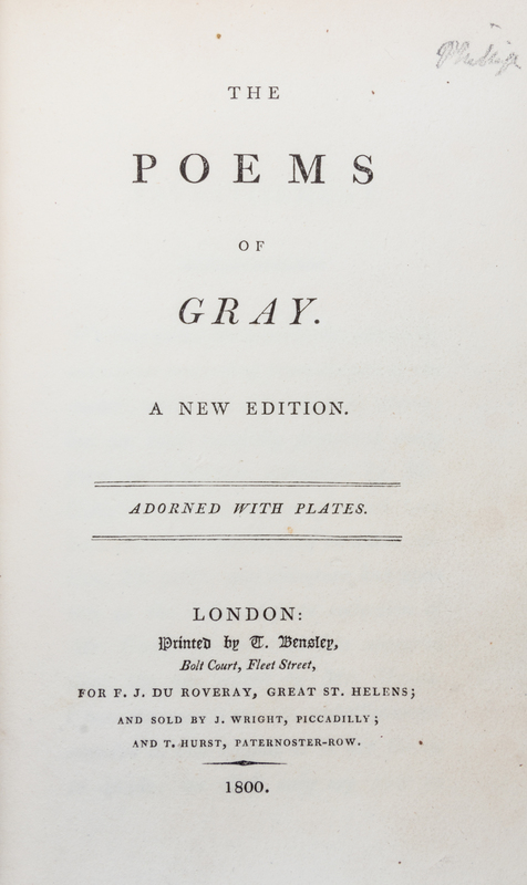 The Poems of Gray. London: T. Bensley, 1800.Small 8vo (7 3/8 x 4 3/4 inches), bound in Etruscan-style calf in the manner of Edwards of Halifax, rebacked, retaining original backstrip, spine with urn gilt design in compartments, marbled endpapers, a.e.g. With a fore edge painting of Yarmouth Castle and Harbor. Previous owner's name and inscription neatly on a front endpaper: Frances Maria Phillips June 1824; light wear to boards; leaf slightly cockling.