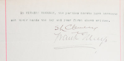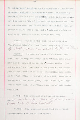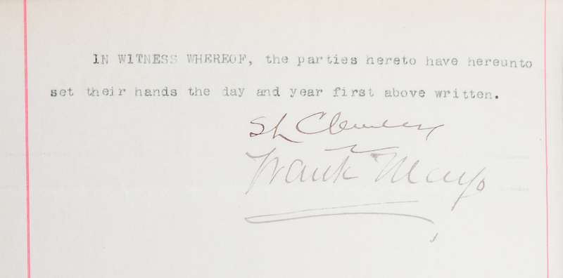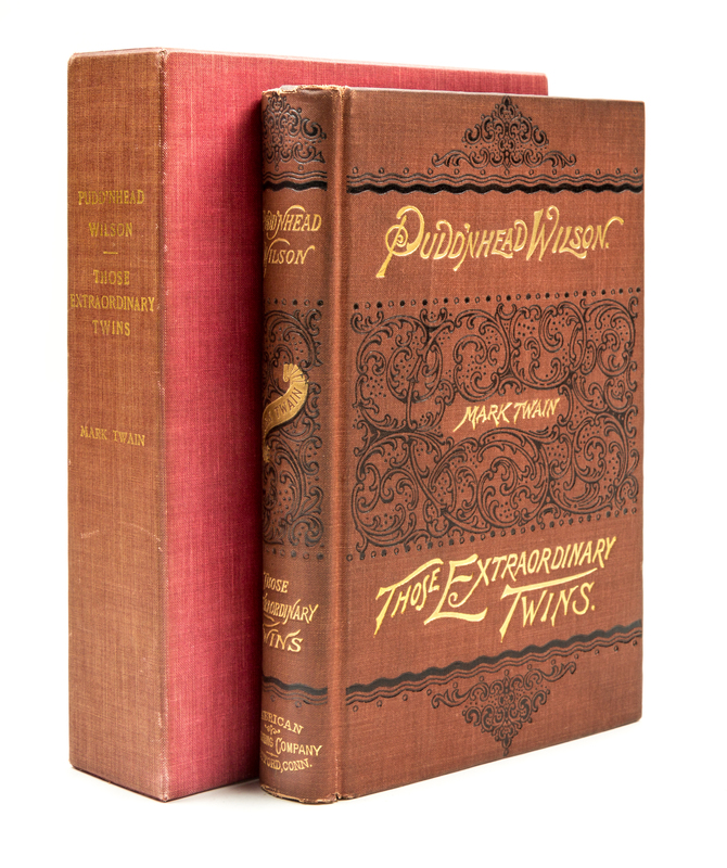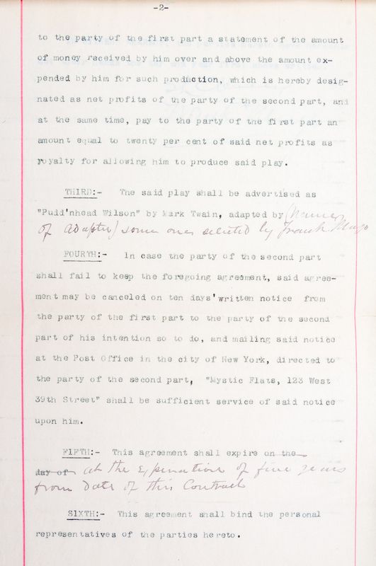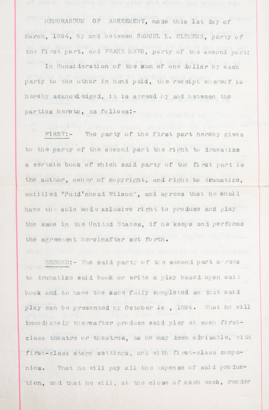 Document signed ("S.L. Clemens"), 3 pp., s.l., n.d. Contract between Clemens and Frank Mayo for the dramatization of Pudd'nhead Wilson and Those Extraordinary Twins. Signed by Mayo below Clemens. Housed in cloth-backed slipcase and chemise along with a first edition of Pudd'nhead Wilson and Those Extraordinary Twins. Hartford: American Publishing Company, 1894.