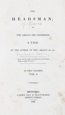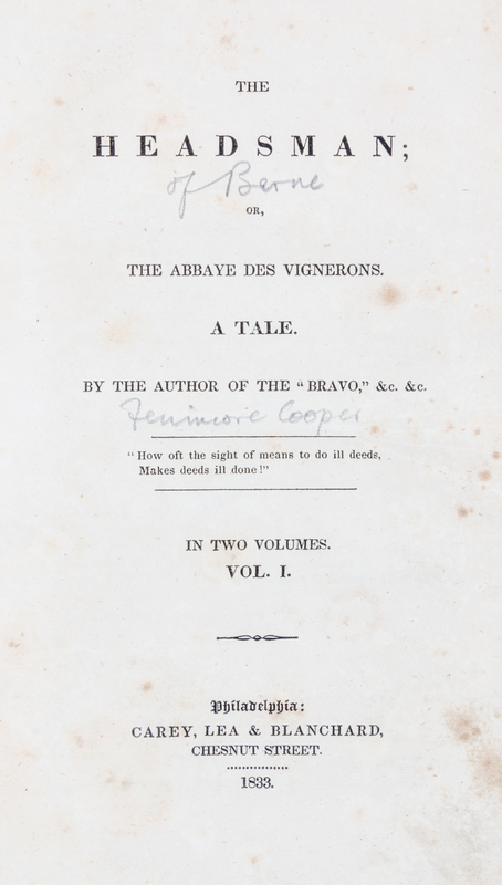 Two works.The Water Witch; or, The Skimmer of the Seas a Tale. London: Henry Colburn and Richard Bentley, 1830. 3 vols. First British edition[Together with:]The Headsman or The Abbaye des Vignerons. Philadelphia: Carey, Lea and Blanchard, 1833. 2 vols. First American edition.
