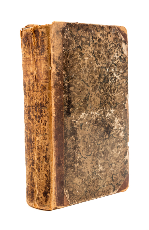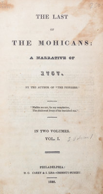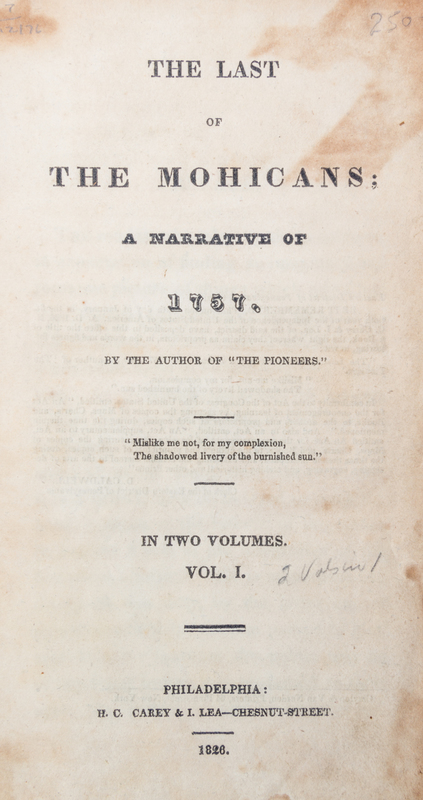 The Last of the Mohicans. Philadelphia: H.C. Carey and I. Lea, 1826.2 vols. in one. 12mo, contemporary 3/4 calf over marbled boards. First edition, first state; volume one with pagination present on p. 71; p.89 misnumbered 93; p.243 reads "XIV" for "XVI"; last "i" is present in pagination on p. viil; copyright notice reads "a Book" in volume one. Volume two title page supplied in facsimile, lacking blanks at beginning and end of volume one and beginning of volume two; final blank present. Early engraved book plate of previous owner to front pastedown: Sarah S. Snow.