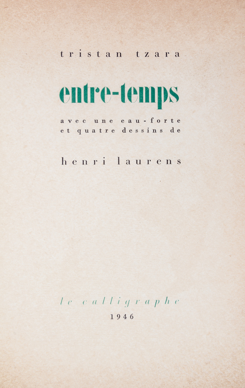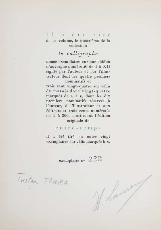 Entre-Temps. Paris: Le Calligraphe, 1946.Small 4to, original printed wraps. Complete with etched frontispiece and four illustrations by Laurens. Limited to 300 copies, of which this is number 230 copies signed by artist and author. Wraps toned.