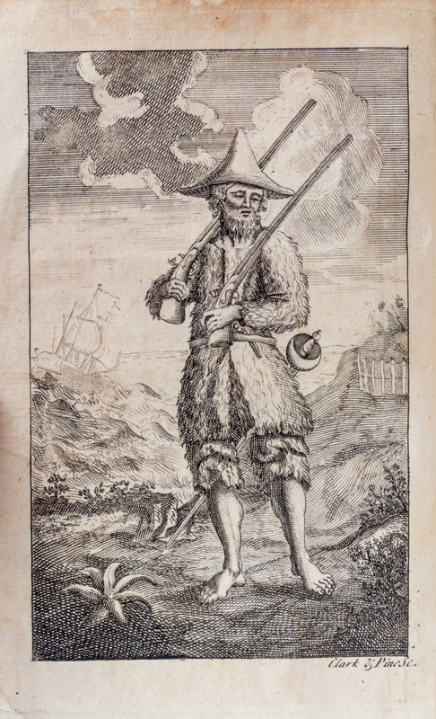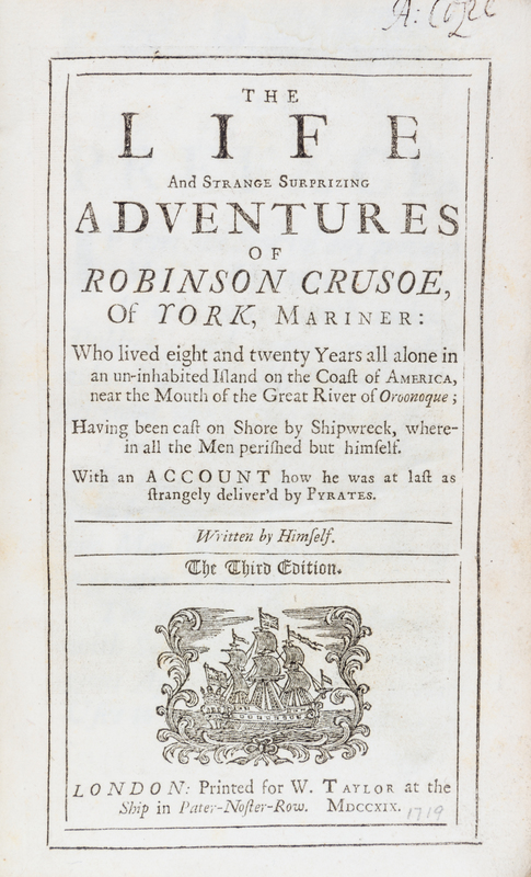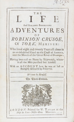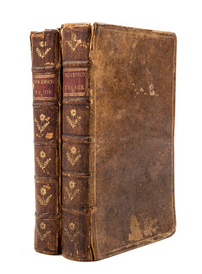 The Life and Strange Surprizing Adventures of Robinson Crusoe, of York, Mariner. [with] The Farther Adventures of Robinson Crusoe. London: W.T. Taylor, 1719.Part one and part two only (of three) 2 vols. Contemporary calf, third edition, book one, first edition, book two. First issue of book two with verso of A4 blank. With fold out map, frontispiece and four page publisher's advertisement at the end of book one. Upper board and f.f.e.p. of book one is detached, manuscript ex-libris to title page book one, ware to board with separation at the head and foot of volume two.