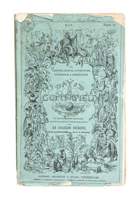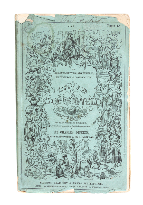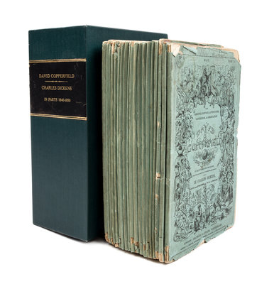 David Copperfield. London: Bradbury and Evans, 1840-1850.20 parts in 19, publisher's printed wraps, cloth-backed slipcase and chemise. First edition in original parts with engraved frontispiece, title and 38 plates by H.K. Browne. Parts I-IX, XI, and XIII-XV collated as complete with all ads (lacking slips in parts X, XII and XVIII; all ads to part XVI; front ads in part XVII; all ads save one slip in parts XIX/XX). Lacking wraps on parts XVI and XIX; part III torn in half.