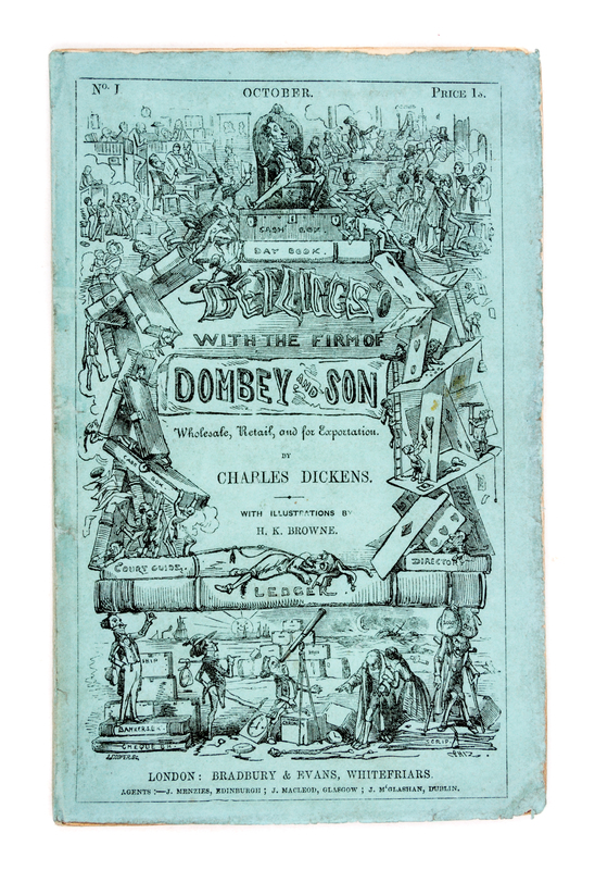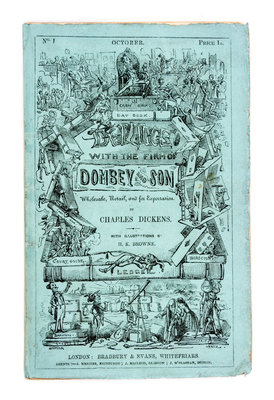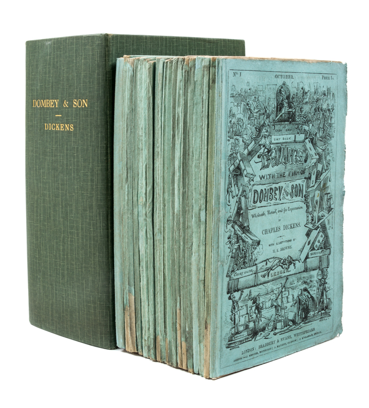 Dombey and Son. London: Bradbury and Evans, 1846-1848.20 parts in 19, publisher's printed wraps, cloth-backed folding case. First edition in original parts, with frontispiece, title and 40 plates by H.K. Brown, dark plate to part XVII. All ads save Man in the Moon slip to part IV present. Professional repairs to some wraps, spines strengthened.