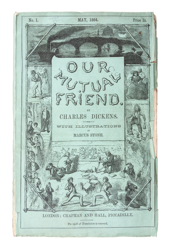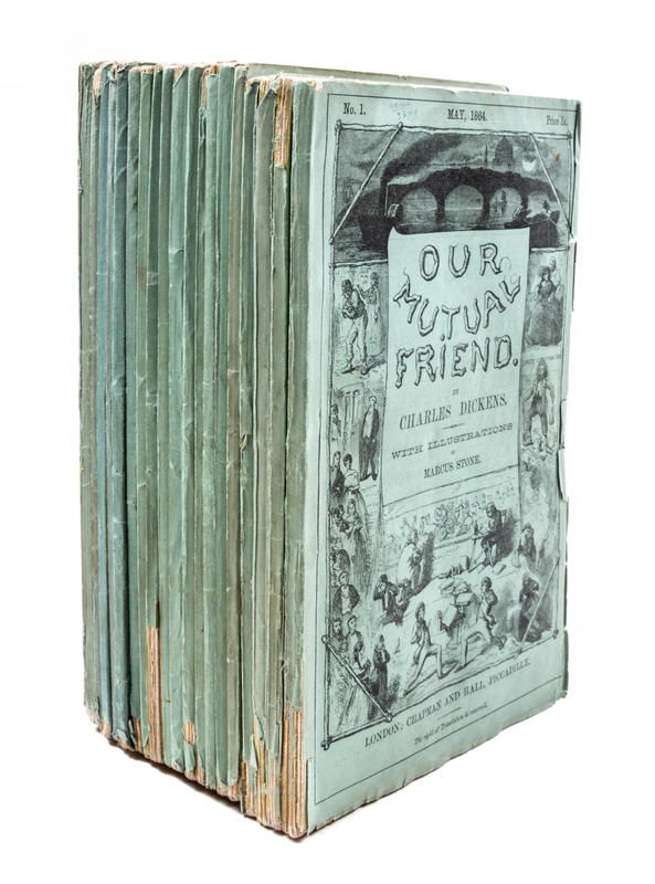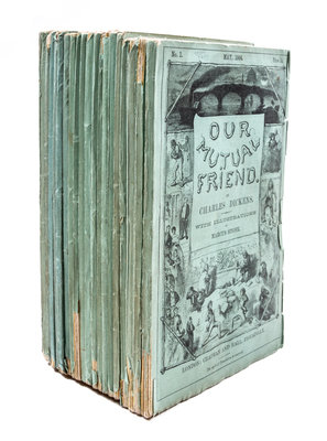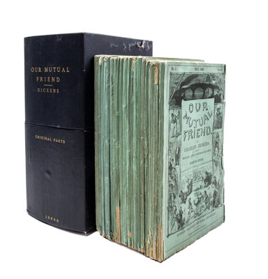 Our Mutual Friend. London: Chapman and Hall, 1864-1865.20 parts in 19, publisher's printed wraps, custom drop box and chemise. First edition in original parts. Complete with 40 etched plates by H.K. Browne. Ads largely complete (except part VI lacking two ads and two slips in the back; part IX lacking one slip; parts XIV and XIX/XX lacking ads slips after plates). Light chipping to wraps; some loss to spine ends; light edgewear to slipcase.