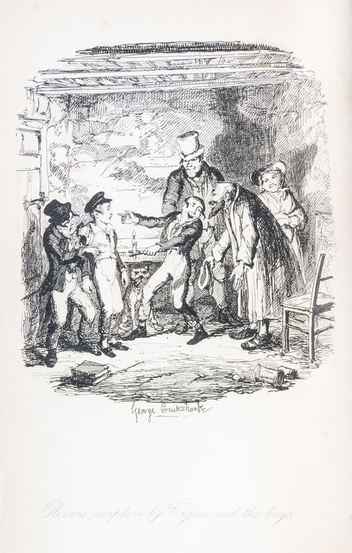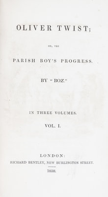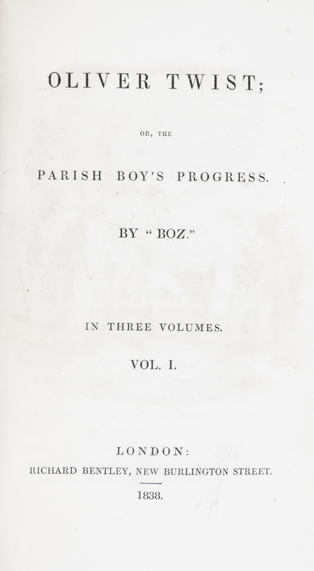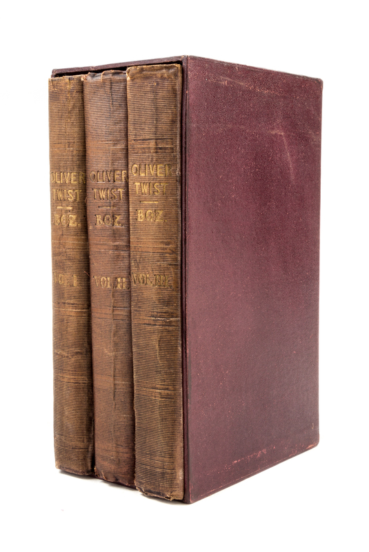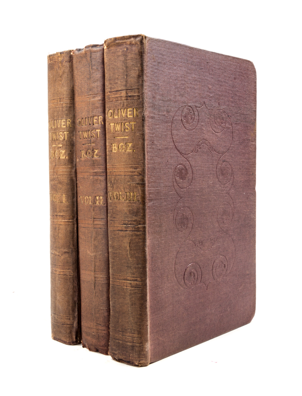 Oliver Twist or The Parish Boy's Progress. By "BOZ". London: Richard Bentley, 1838. 3 vols. 8vo, publishers' purple cloth with arabesque design, custom slipcase stamped. First edition, first issue, with fireside plate and without Dickens' name to title page. Boards uniformly faded; hinges started; boards cocked; some loss to spine ends and corners; manuscript ex-libris to f.f.e.p.