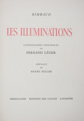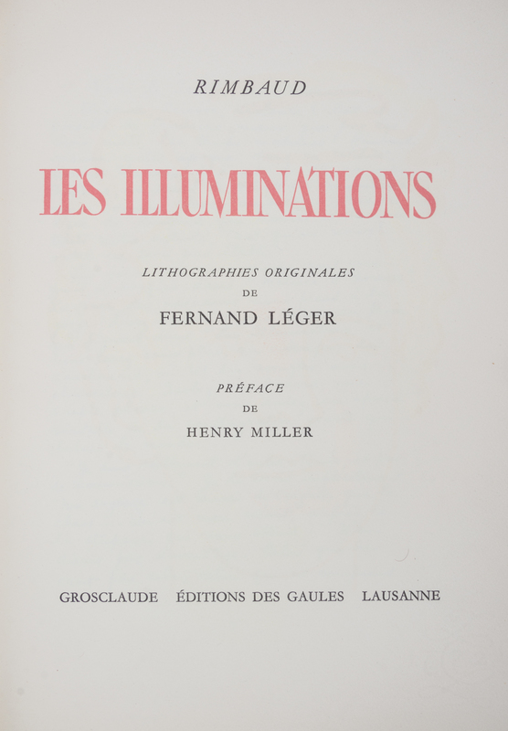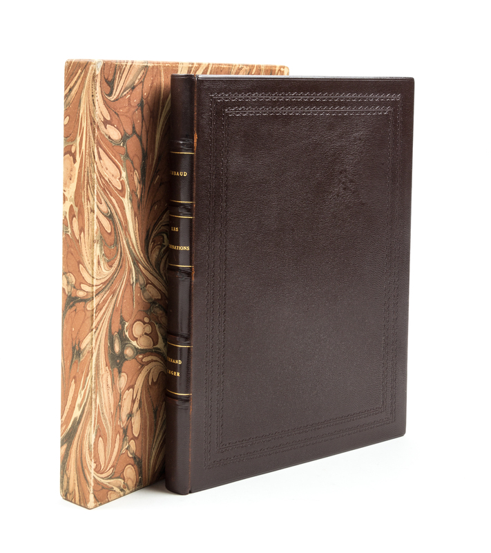 Les Illuminations. Preface by Henry Miller. Lausanne: Editions de Gaules, 1949. 4to, rebound in full deep brown morocco with marbled endpapers, t.e.g., matching slipcase, original wrappers bound in, printed by Roth and Sauter, Lausanne. Limited edition, number 226 on velin teinte from a total edition of 395, signed by the artist and publisher in ink on the limitation page. Complete, with 15 lithographs (11 pochoir) by Leger. Light rubbing to slipcase and along edge of spine; some light offsetting; exhibition postcard laid in.