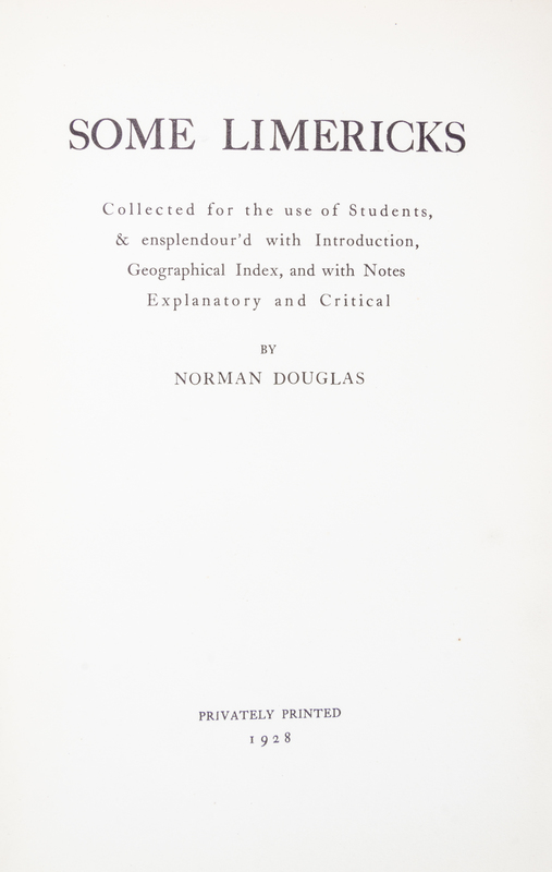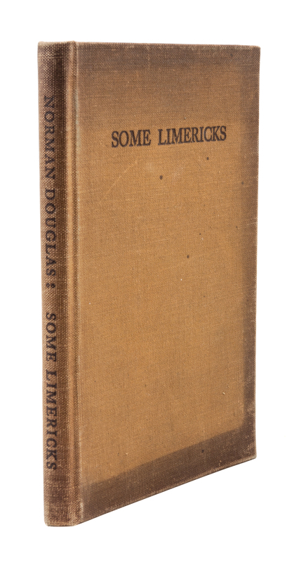 Some Limericks. Privately Printed, 1928.8vo, original publisher's cloth. Contains a lengthy dedication inscription and a caricature, signed by Norman Douglas. The spine and edges of the binding are darkened, with minor shelfwear. There is one area where the pages are separating.